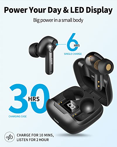🎺【30 H Playback & Great Design】The earphones can last 6 hours on a full charge, the charging case with a power display can charge the earbuds 4 times, and the Bluetooth earbuds can play music for a total of 30 h. Fast charging via USB-C and enjoy all-day listening without worrying about running out of battery. Lightweight design for easy portability. The earbuds feature a precision-engineered shell with a water-resistant nano-coating that protects against splash damage from sweat and raindrops.