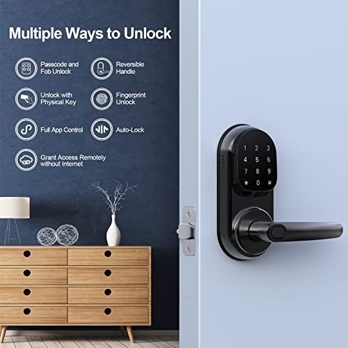 Keyless Entry Smart Lock – 5 ways to unlock your door: Fingerprint + Passcode + Key Fob + Keys + App. Never worry about forgetting your keys and lock yourself out. Auto-lock is enabled in case you forget to lock on the way out.