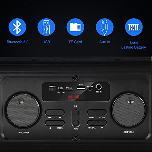 MULTIFUNCTIONAL PA SPEAKER: Designed with Bluetooth 5.0, this karaoke machine ensures quick bluetooth connection and smooth transmission. You’ll also stream music from AUX, TF/USB input. Record audio when streaming through the microphone with USB/TF card inserted. Use the speaker as a power bank and charges your smartphone / tablet by means of USB port in emergency. Regulate the volume or mode with the remote Regulate with ease