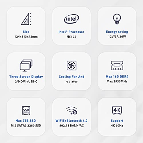 【Performance】Inter 11th generation processor N5105 2.9Ghz 4 processor 4 threads 4MB cache, 16GB DDR4 500GB M.2 SATA 3 SSD,Support 2.5 inch HDD/SATA SSD,Support Dual HDMI/USB C 3.0 4K 60Hz 3 Display output