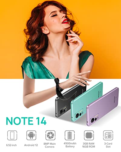 Ulefone Unlocked Smartphone, Note 14 Cell Phone Unlocked, Android 12, 6.52" IPS Full-Screen, 4500mAh, 3GB + 16GB, Triple Card Slots, 8MP Camera, Dual SIM, Face Recognition, 4G Cheap Phones - Green