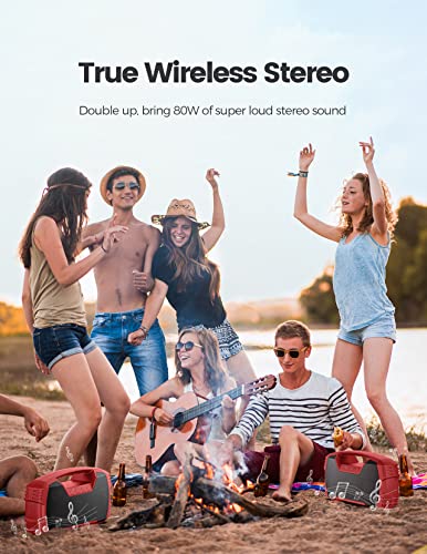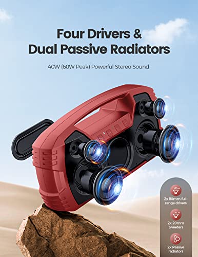 Powerful Stereo Speaker – Featuring 4 dedicated drivers with 2 15W full-range drivers and 2 5W tweeters, along with 2 passive radiators on the front and rear, this loud Bluetooth speaker delivers 40W surround sound (peak 60W) and pumps out well-balanced midrange, crisp treble, and punchy bass with virtually no distortion, letting you enjoy the music to the utmost. Pair 2 speakers together for 80 watt stereo sound